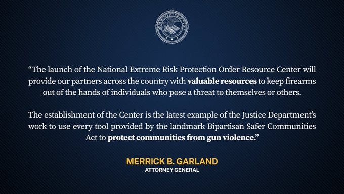 “The launch of the National Extreme Risk Protection Order Resource Center will provide our partners across the country with valuable resources to keep firearms out of the hands of individuals who pose a threat to themselves or others,” said Attorney General Merrick B. Garland. “The establishment of the Center is the latest example of the Justice Department’s work to use every tool provided by the landmark Bipartisan Safer Communities Act to protect communities from gun violence.”